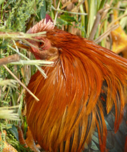 Il Cappone di Morozzo è caratterizzato da un piumaggio variopinto con sfumature che vanno dal rosso al biondo scuro nella criniera.